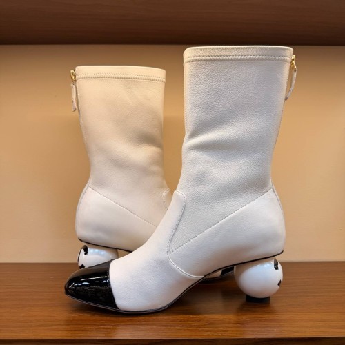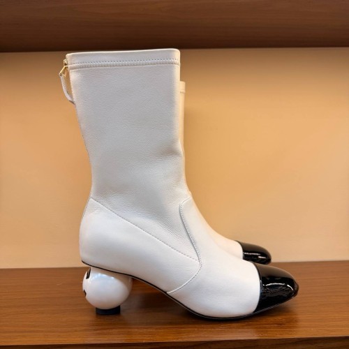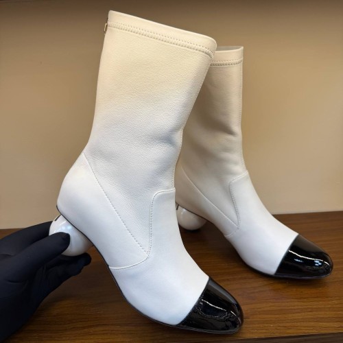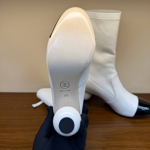 Женские белые ботильоны Chanel с лакированным черным носком из натуральной кожи. Силуэт ботильон дополнили круглым каблуком, создав интересный асимметричный акцент. Модель завершили удобной молнией на задней части. В нашем интернет-магазине вы можете купить копии ботильон с доставкой по Москве и по всей России.