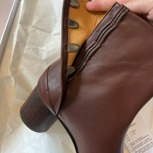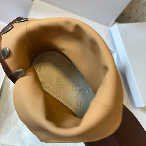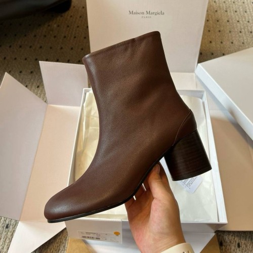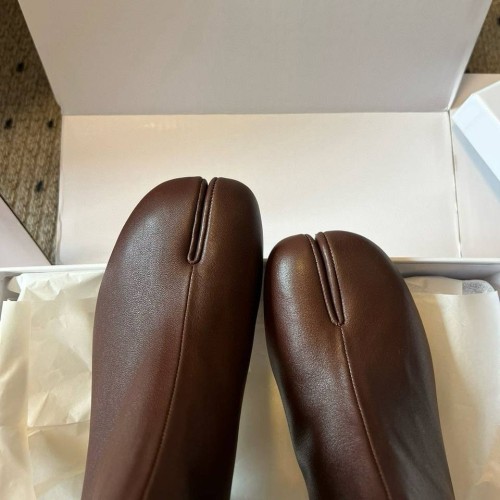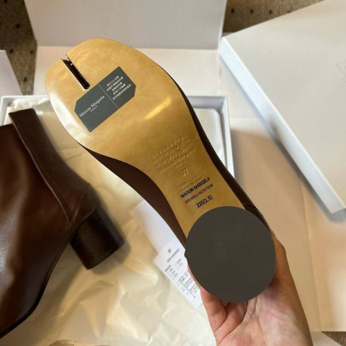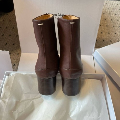 Коричневые ботильоны Maison Margiela из натуральной кожи. Модель дополнили раздвоенным носком, который обеспечивает комфортную посадку по ноге. Акцент на себя берет устойчивый каблук, высотой 8 см. Минималистичный дизайн без лишних деталей делает пару идеальным выбором для повседневных образов. В нашем интернет-магазине вы можете купить копии ботильон с доставкой по Москве и по всей России.