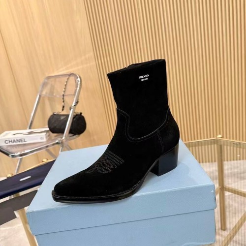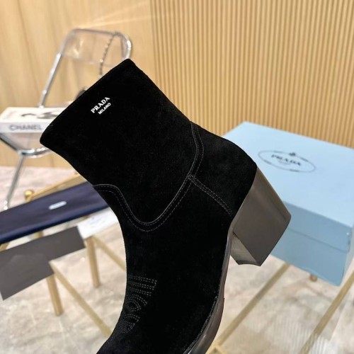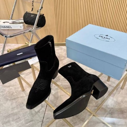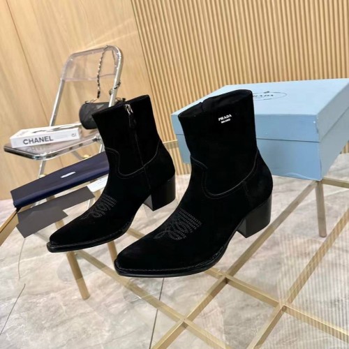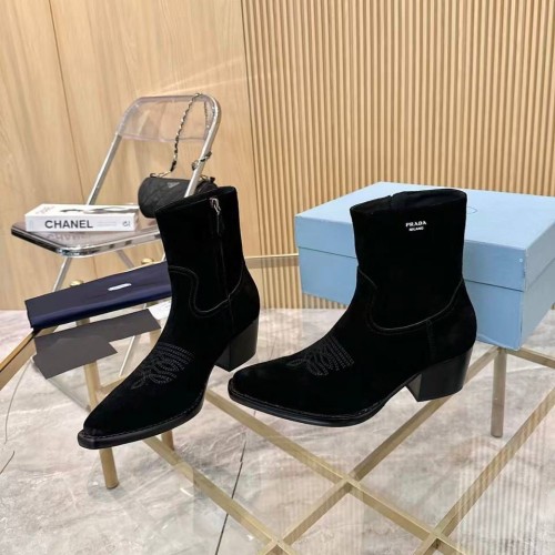 Черные ботильоны Prada из натуральной замши. Выразительная вышивка и лаконичный дизайн делают пару универсальной для гардероба. Устойчивый каблук, а также стелька позволяют чувствовать себя комфортно на протяжении всего дня. В нашем интернет-магазине вы можете купить копии ботильон с доставкой по Москве и по всей России.