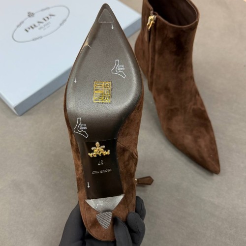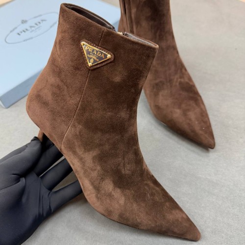 Коричневые ботильоны Prada из натуральной замши. Ботильоны станут характерной деталью вашего индивидуального стиля и точкой притяжения внимания. Пара на устойчивом каблуке, высотой 6 см и молнией с внутренней стороны идеально завершит выбранный вами отзыв. В нашем интернет-магазине вы можете купить копии ботильон с доставкой по Москве и по всей России.