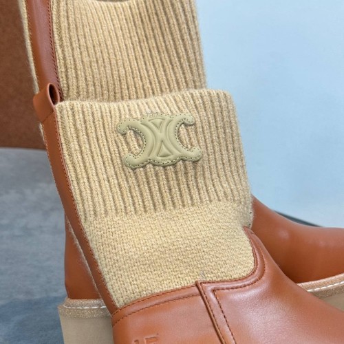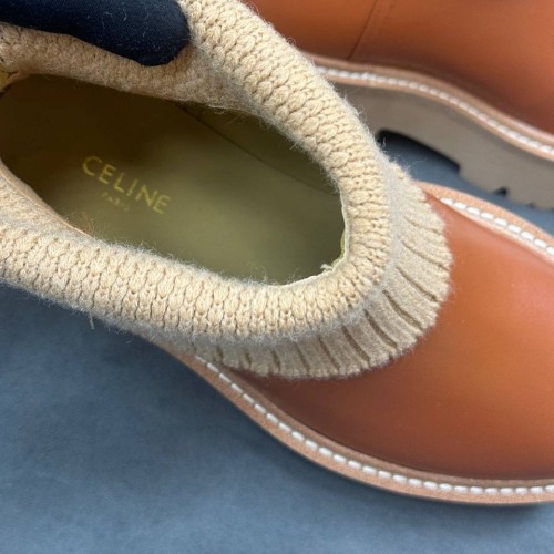 Коричневые ботинки с бежевым носком Celine из натуральной кожи и шерсти. Сочетание трендового лаконичного дизайна и современного прочтения. Удобная платформа позволяет сохранить ноги в тепле и сухости. В нашем интернет-магазине вы можете купить копии ботинок с доставкой по Москве и по всей России.