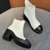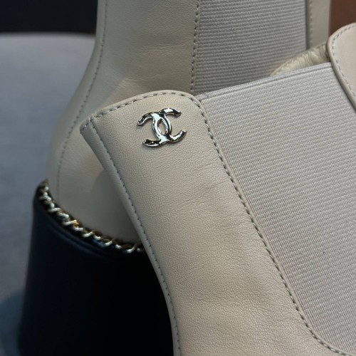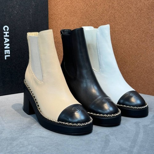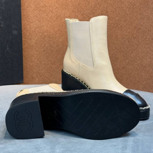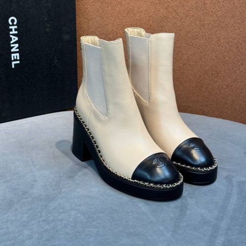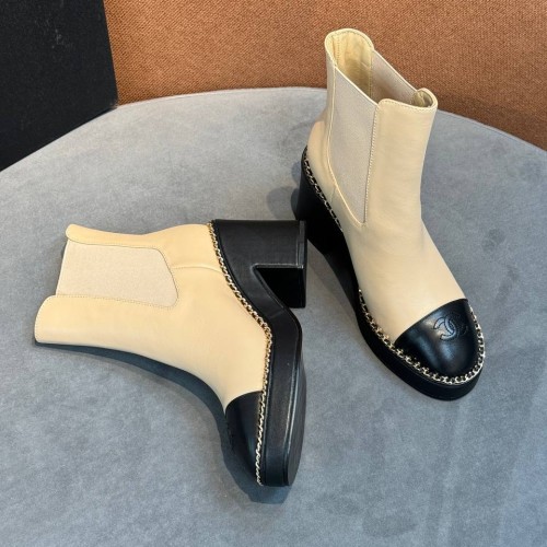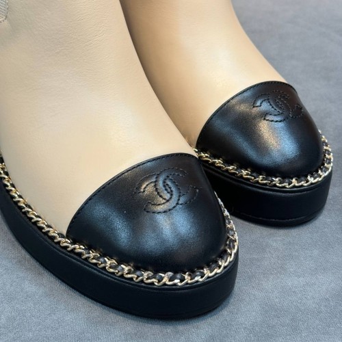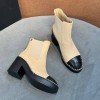Бежевые женские ботинки Chanel с черным носком из натуральной кожи. Ботинки, балансирующие между классикой и современными решениями. Силуэт дополняют каблук, высотой 8 см и увеличенная контрастная подошва, защищающая от скольжения. В нашем интернет-магазине вы можете купить копии ботинок с доставкой по Москве и по всей России.