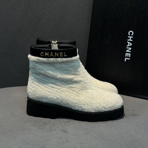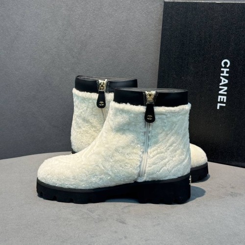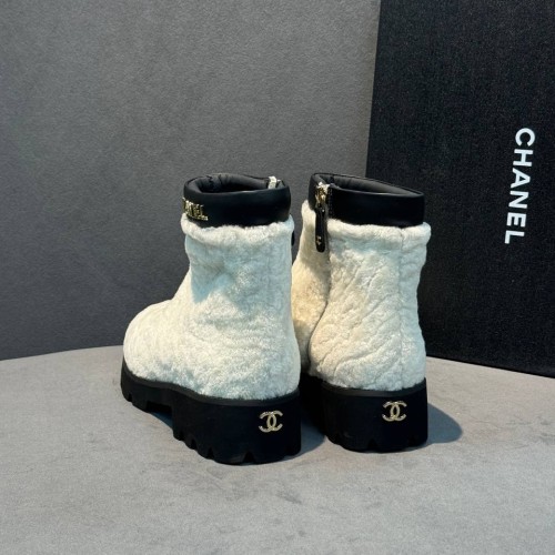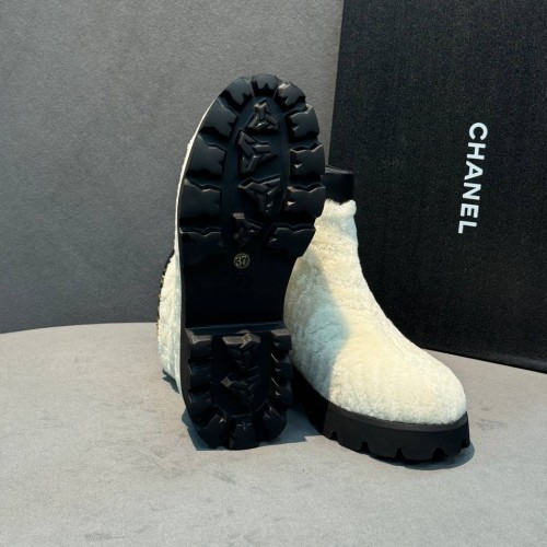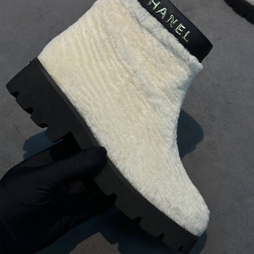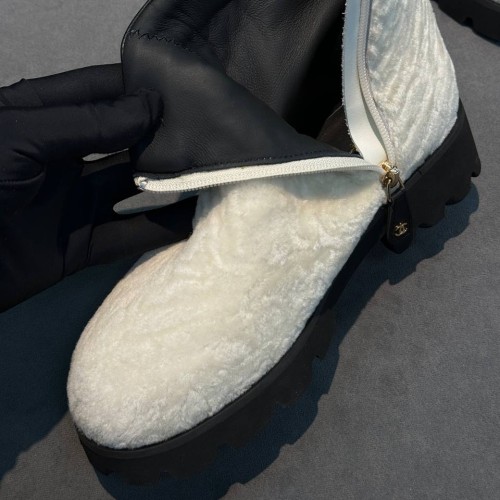 Белые женские ботинки Chanel из натурального меха и натуральной кожи. Уютные ботинки не только позволят вам собирать расслабленные городские образы и сочетания в эстетике apres-ski, но и надежно защитят в зимние холода. Модель дополнена высокой облегченной подошвой и удобной молнией - все эти детали в совокупности делают ее максимально комфортной. В нашем интернет-магазине вы можете купить копии ботинок с доставкой по Москве и по всей России.
