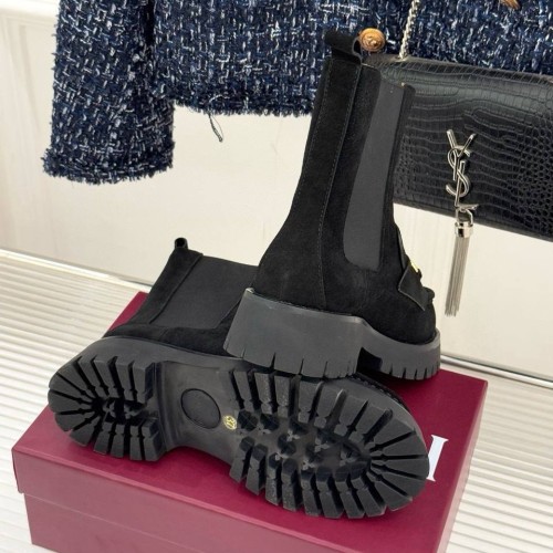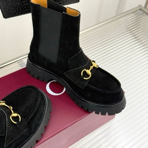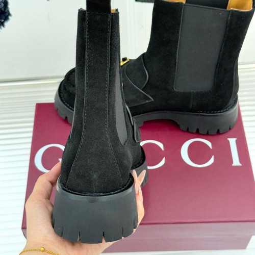 Черные ботинки Gucci с золотой пряжкой из натуральной замши. Сочетание стиля и актуального дизайна — ботинки станут элегантным дополнением к деловому стилю или вечернему наряду. Удобная колодка гарантируют легкую походку и максимальный комфорт. В нашем интернет-магазине вы можете купить копии ботинок с доставкой по Москве и по всей России.