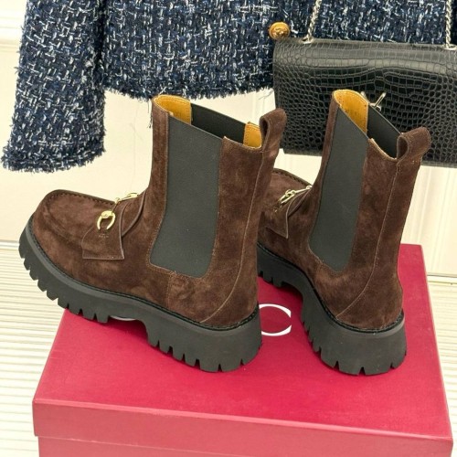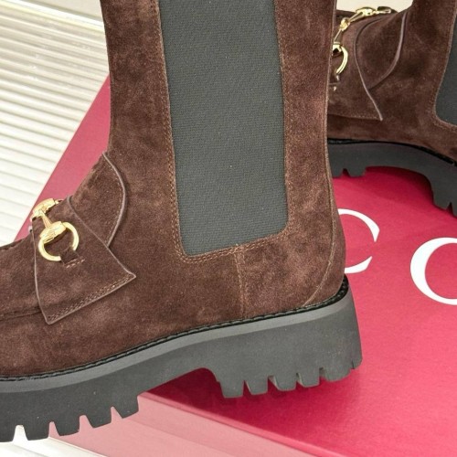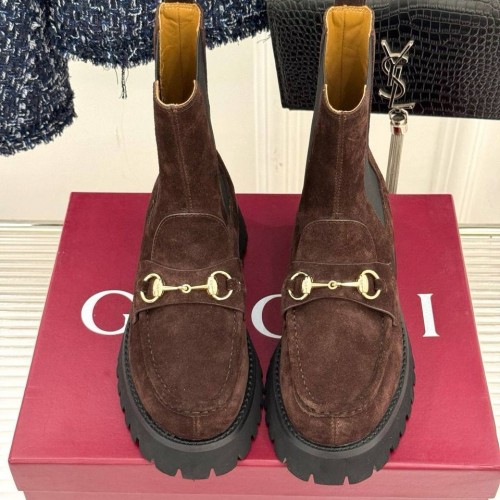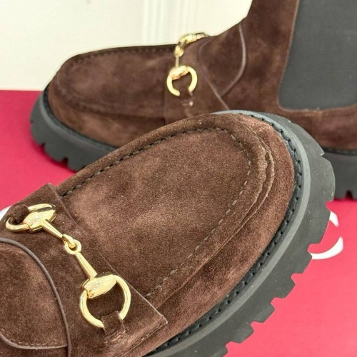 Коричневые ботинки Gucci с золотой пряжкой из натуральной замши. Ботинки из новой коллекции объединяют уют и актуальный стиль. Рельефная подошва предотвращает скольжение, а универсальный коричневый цвет позволяет легко сочетать пару с любыми повседневными образами. В нашем интернет-магазине вы можете купить копии ботинок с доставкой по Москве и по всей России.