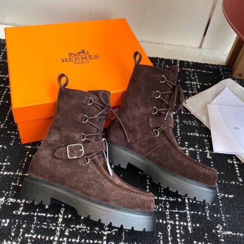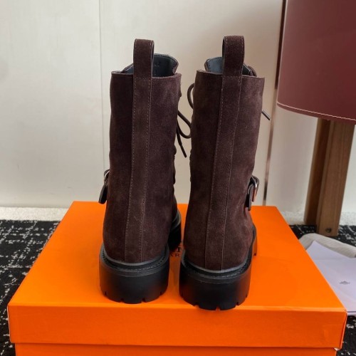 Коричневые женские ботинки Hermes из натуральной замши. В переменчивую погоду межсезонья ваш гардероб заслуживает модели в идеальном балансе стиля и комфорта. Устойчивый каблук, надежная шнуровка и подошва с протекторами обеспечивают удобство, а современный дизайн позволяет сделать модель универсальным дополнением для большинства повседневных образов. В нашем интернет-магазине вы можете купить копии ботинок с доставкой по Москве и по всей России.