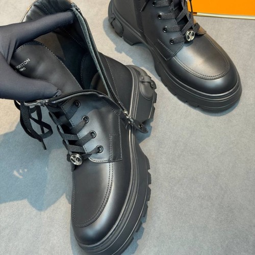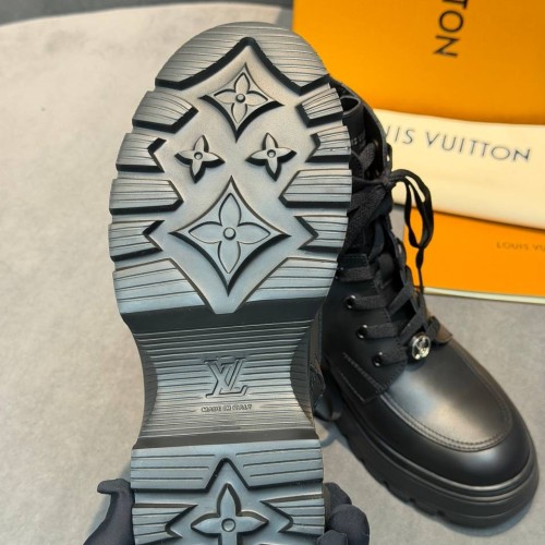 Черные женские ботинки Louis Vuitton из натуральной кожи со вставками из канвы. Ботинки с высокой шнуровкой и устойчивым каблуком делают пару универсальным игроком в любом гардеробе. Лаконичный силуэт и продуманная форма - элементы дизайна, позволяющие интегрировать пару в многочисленные повседневные сочетания. В нашем интернет-магазине вы можете купить копии ботинок с доставкой по Москве и по всей России.
