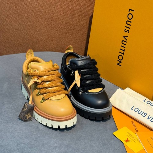 Желтые женские ботинки Louis Vuitton из натуральной кожи. Компромисс между комфортом и стилем в холодную погоду найден, и это ботинки из новой коллекции. За комфорт отвечают увеличенная подошва с протекторами, продуманная конструкция и удобная шнуровка. В нашем интернет-магазине вы можете купить копии ботинок с доставкой по Москве и по всей России.
