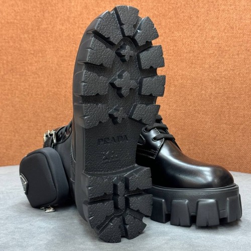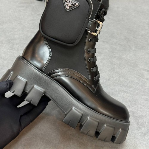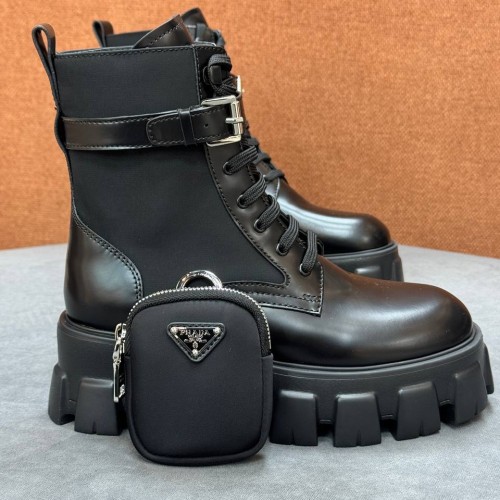 Черные женские ботинки Prada из натуральной кожи и ткани. Комфортные ботинки на тракторной подошве, которые стали элегантным сочетанием современных решений и традиционного образа. Съемная мини-сумка, закрепленная на ремешке, сыграет роль дополнительного кармана и создаст эффектный акцент. В нашем интернет-магазине вы можете купить копии ботинок с доставкой по Москве и по всей России.