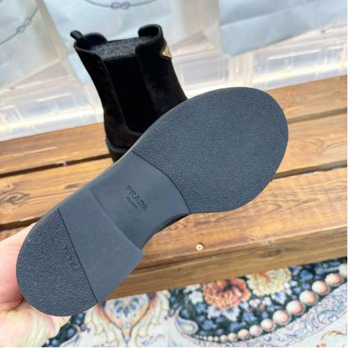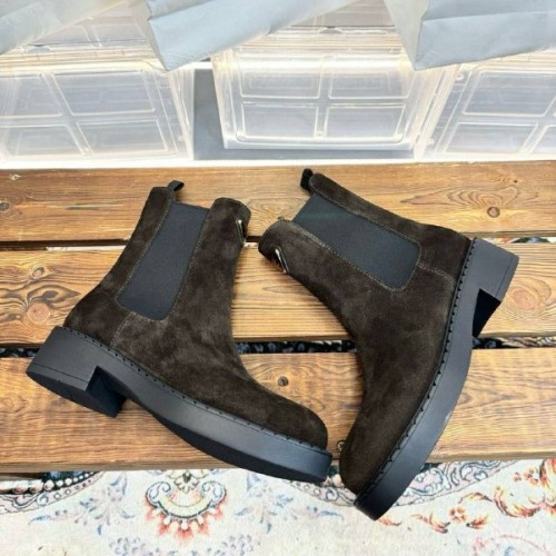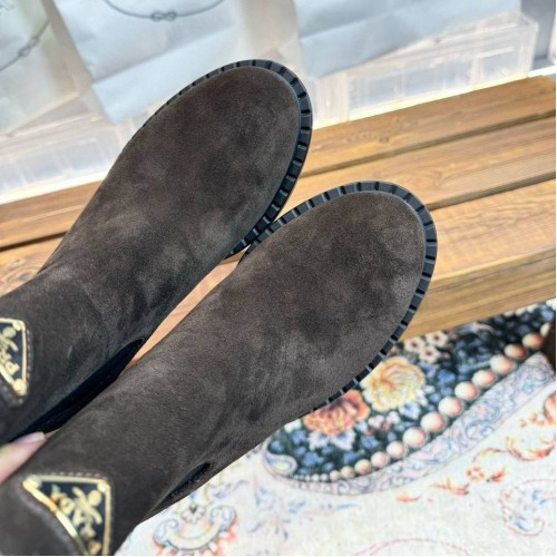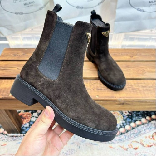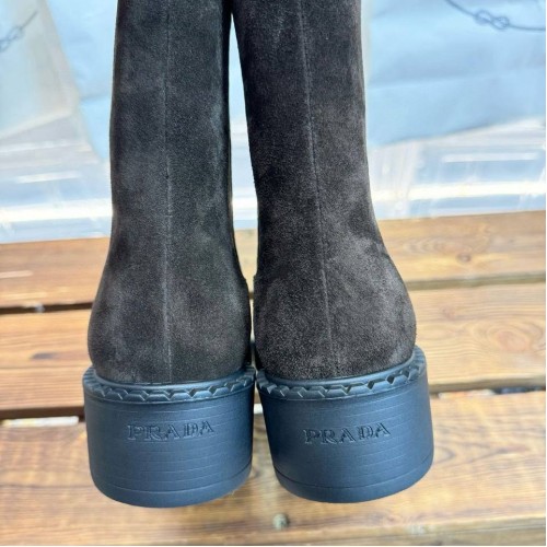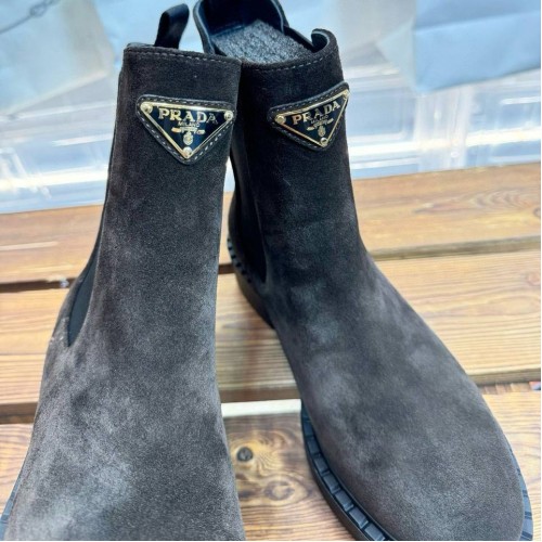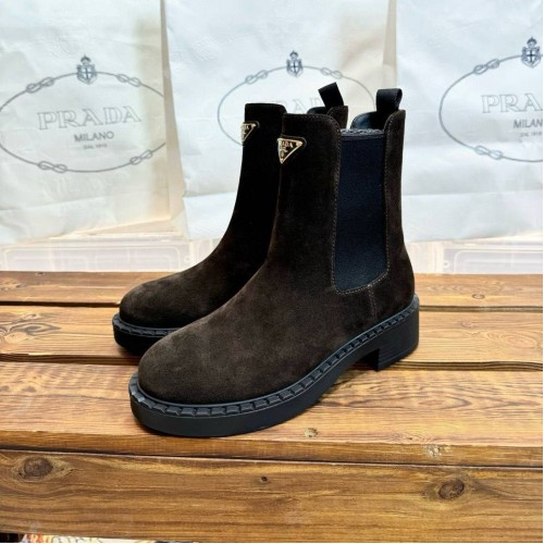 Коричневые женские ботинки Prada из натуральной замши. Классическое решение для делового и повседневного стиля. Модель из новой коллекции выполнена в лаконичном дизайне с элегантными минималистичными элементами. Благодаря универсальности, ботинки будут гармонично сочетаться с различными образами. В нашем интернет-магазине вы можете купить копии ботинок с доставкой по Москве и по всей России.