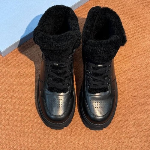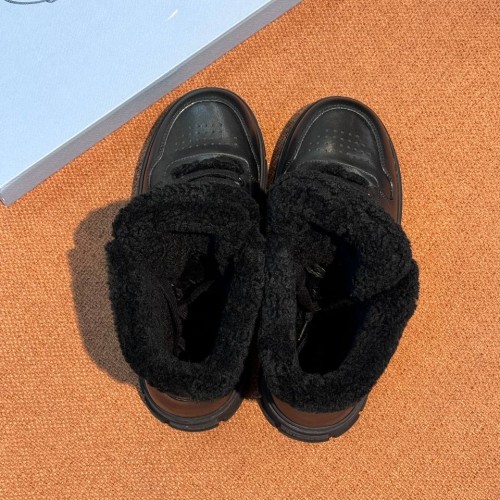Черные зимние ботинки Prada из натуральной кожи и натурального меха. Ботинки на шнуровке - классика, в которой всегда можно быть уверенной. Натуральная кожа универсального черного цвета позволит легко интегрировать модель в повседневные образы, а подкладка и стелька из натурального меха обеспечат тепло в холодную погоду. В нашем интернет-магазине вы можете купить копии ботинок с доставкой по Москве и по всей России.