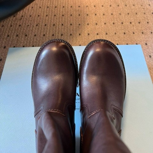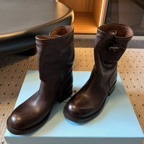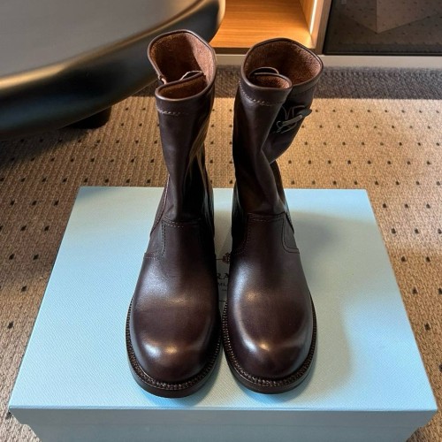 Коричневые женские ботинки Prada из натуральной кожи. В переменчивую погоду межсезонья ваш гардероб заслуживает модели в идеальном балансе стиля и комфорта. Устойчивый каблук и подошва обеспечивают удобство, а современный дизайн позволяет сделать модель универсальным дополнением для большинства повседневных образов. В нашем интернет-магазине вы можете купить копии ботинок с доставкой по Москве и по всей России.