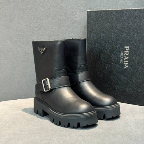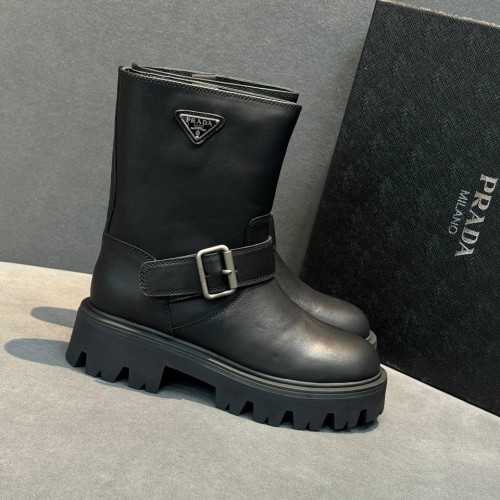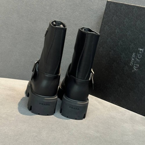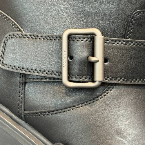 Черные женские ботинки Prada из натуральной кожи. Модель отличается расслабленной формой: округлая носочная часть с пряжкой сбоку и лаконичный силуэт. Пара дополнена высокой подошвой с выраженным протектором, который предотвращает скольжение. В нашем интернет-магазине вы можете купить копии ботинок с доставкой по Москве и по всей России.
