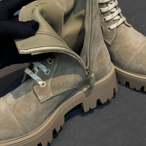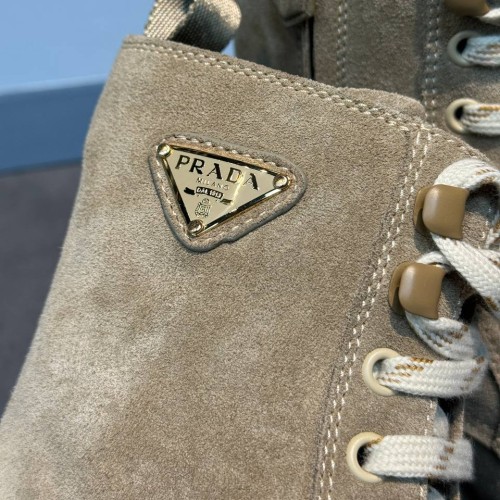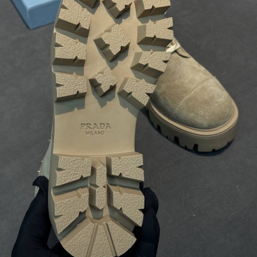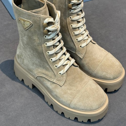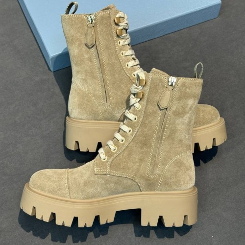 Бежевые женские ботинки Prada из натуральной замши. Молния с внутренней стороны пары надежно фиксирует голенище и позволяет легко снимать и надевать ботинки. Утолщенная подошва с глубоким протектором защитит деликатный материал от грязи и слякоти. В нашем интернет-магазине вы можете купить копии ботинок с доставкой по Москве и по всей России.