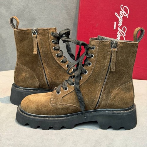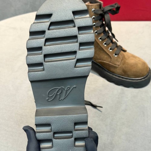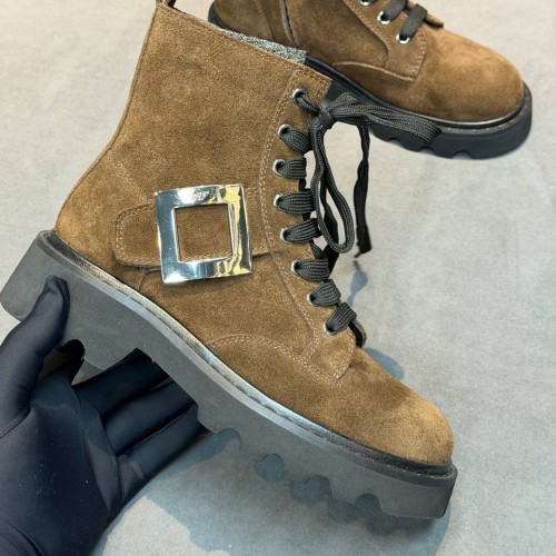 Коричневые ботинки Roger Vivier из натуральной замши. Модель дополнена удобной шнуровкой. Высокая подошва стала не только акцентным элементом дизайна, но и функциональной деталью, усиливающей защиту от холода и загрязнений в зимний период. В нашем интернет-магазине вы можете купить копии ботинок с доставкой по Москве и по всей России.