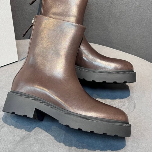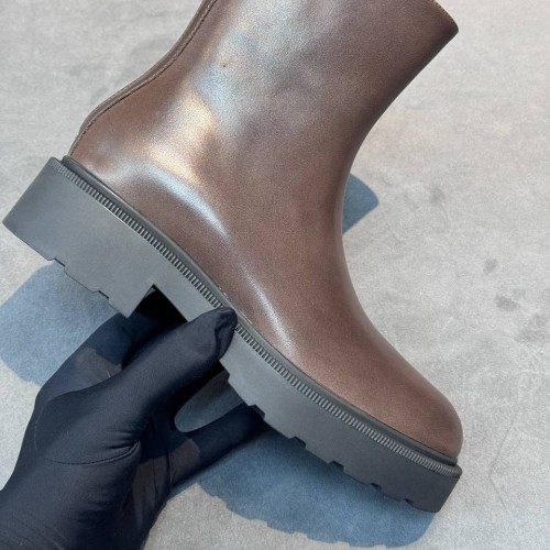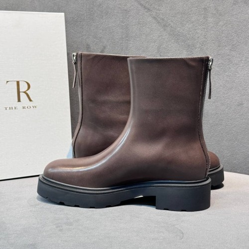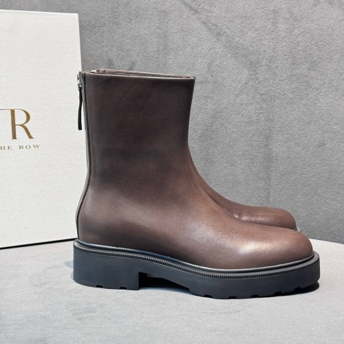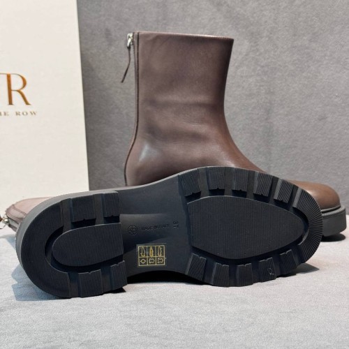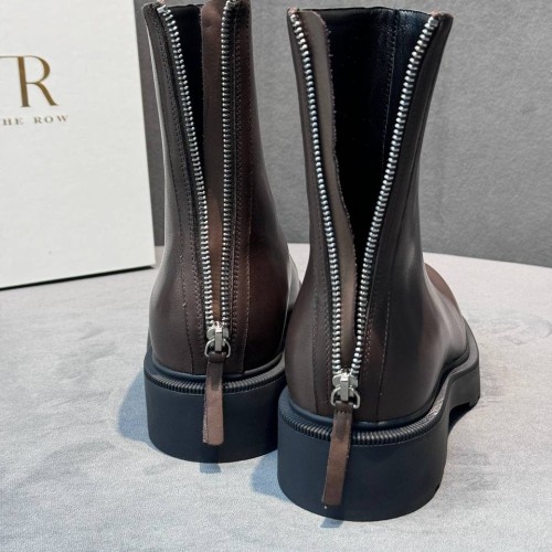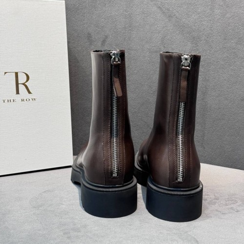 Коричневые женские ботинки The Row из натуральной гладкой кожи. Модель дополнили молнией сзади, которая обеспечивает надежную фиксацию и комфортную посадку по ноге. Главный акцент на себя берет широкая утолщенная подошва скульптурной формы из облегченной резины, которая отвечает за амортизацию и комфорт во время движения. В нашем интернет-магазине вы можете купить копии ботинок с доставкой по Москве и по всей России.