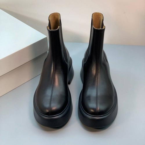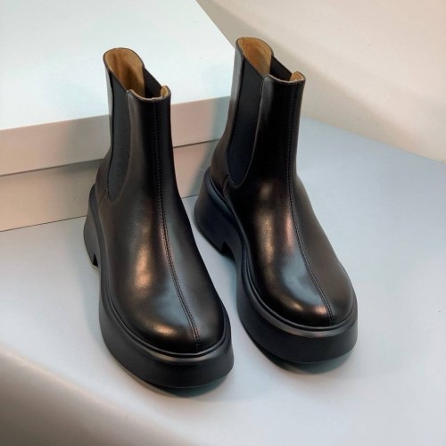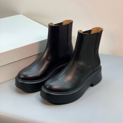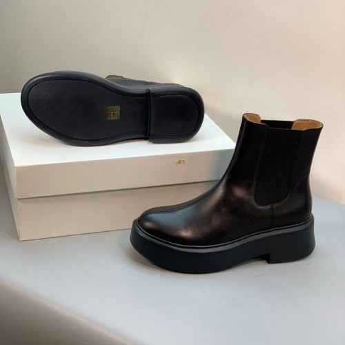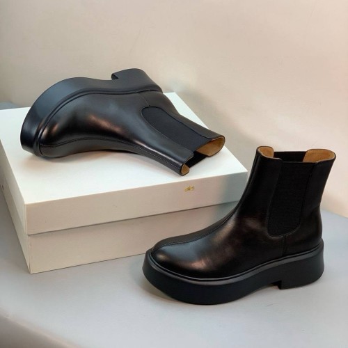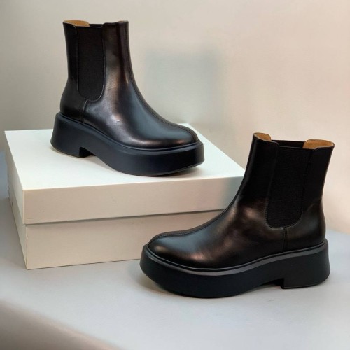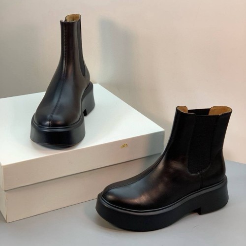 Черные женские ботинки The Row из натуральной кожи. Челси - универсальная основа для разнообразных образов. Эта модель легко вписывается как в ансамбли с юбками и платьями, так и в более повседневные сочетания с брюками или джинсами, заправленными внутрь. Классический черный оттенок делает обувь практичной и сочетаемой с большинством цветов. В нашем интернет-магазине вы можете купить копии ботинок с доставкой по Москве и по всей России.