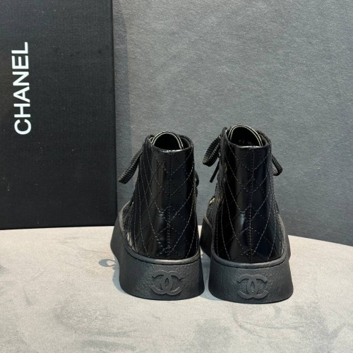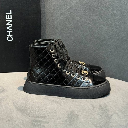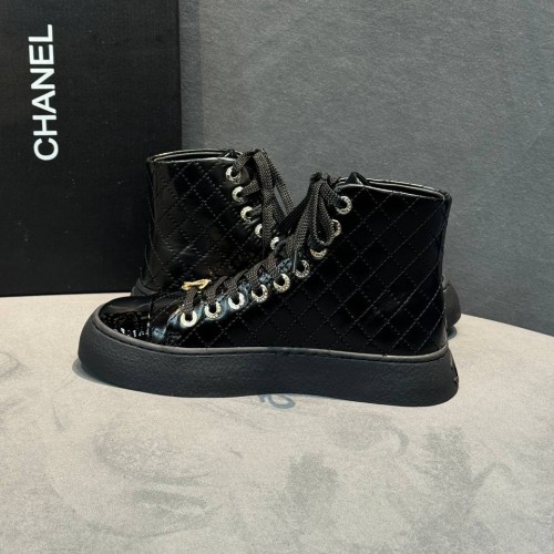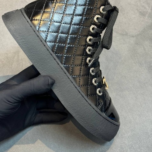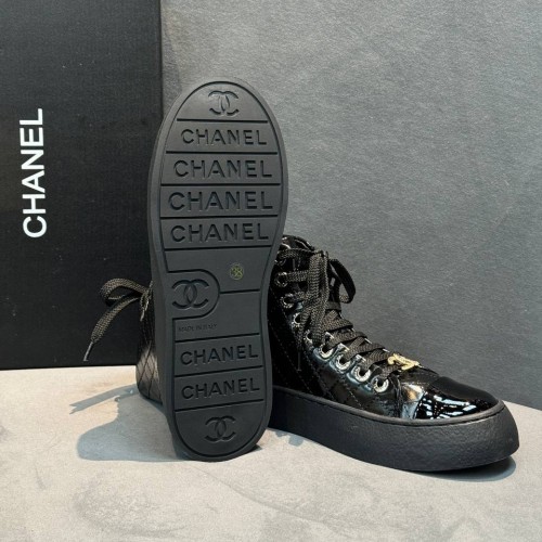 Черные высокие кеды Chanel из натуральной кожи и лакированной кожи. Одна из самых практичных и удобных моделей, которая никогда не потеряет своей актуальности. Лаконичный дизайн с высокой шнуровкой и устойчивой подошвой делает пару универсальным игроком в любом гардеробе. В нашем интернет-магазине вы можете купить копии кед с доставкой по Москве и по всей России.