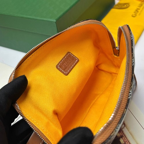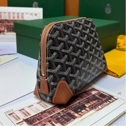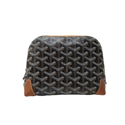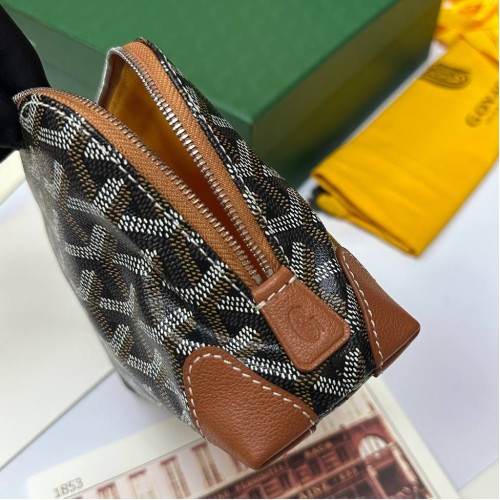 Коричневая косметичка Goyard из канвы и натуральной кожи. Идеальный аксессуар для хранения косметики, аксессуаров и средств личной гигиены. Благодаря компактной и удобной форме ее легко взять с собой в дорогу. В нашем интернет-магазине вы можете купить копии косметичек с доставкой по Москве и по всей России.