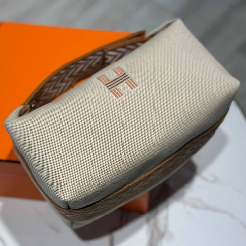 Бежевая косметичка Hermes из текстиля. Удобный аксессуар, который гармонично сочетает в себе элегантность, практичность и фирменный стиль модного дома. Эта модель идеально подходит для современных женщин, ценящих качество и функциональность. В нашем интернет-магазине вы можете купить копии косметичек с доставкой по Москве и по всей России.