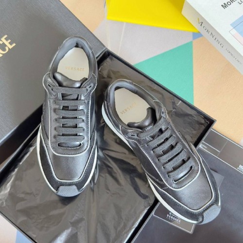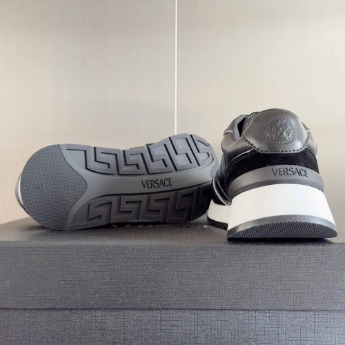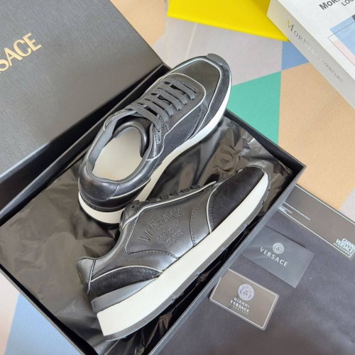 Черные кроссовки Versace из натуральной кожи со вставками из натуральной замши. Сочетание стиля и актуального дизайна - кроссовки станут трендовым дополнением к ежедневному стилю. Удобная контрастная подошва гарантирует легкую походку и максимальный комфорт. В нашем интернет-магазине вы можете купить кроссовок с доставкой по Москве и по всей России.