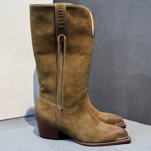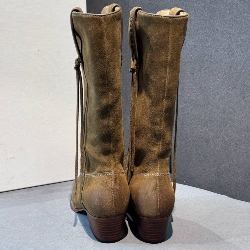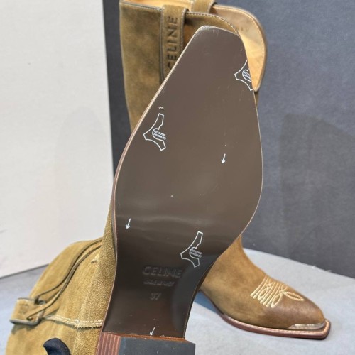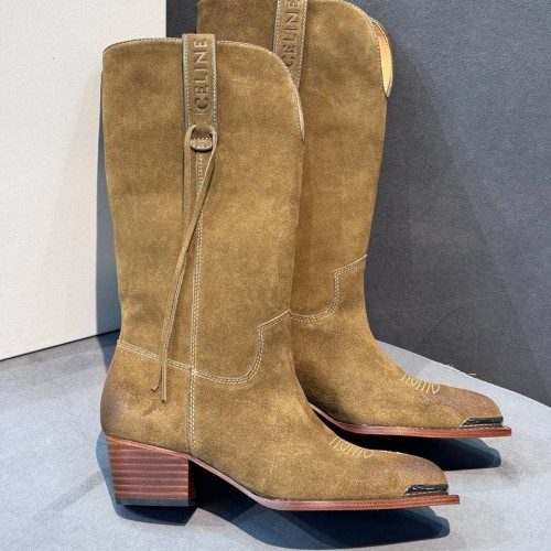 Женские сапоги Celine горчичного оттенка из натуральной замши. Заостренная носочная часть с металлической деталью рифмуется с фурнитурой и добавляет выразительный контраст. Крупный скошенный каблук дополняет модель и придает ей устойчивость. В нашем интернет-магазине вы можете купить копии сапог с доставкой по Москве и по всей России.