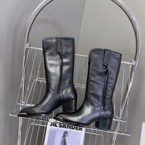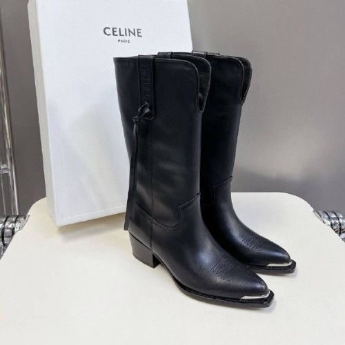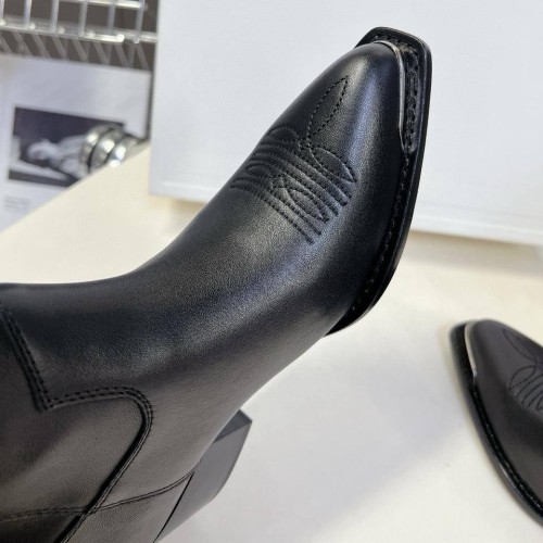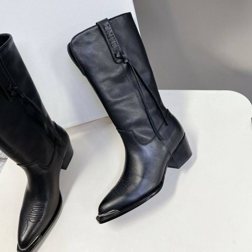 Женские черные сапоги Celine из натуральной кожи. Дизайн казаков дополнен акцентной серебряной фурнитурой. Такое решение моментально придает паре яркий характер и позволяет экспериментировать со стилизациями. В нашем интернет-магазине вы можете купить копии сапог с доставкой по Москве и по всей России.