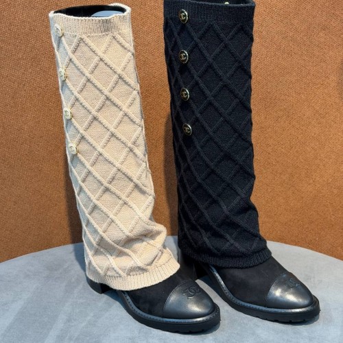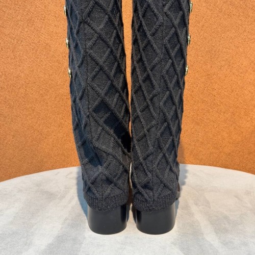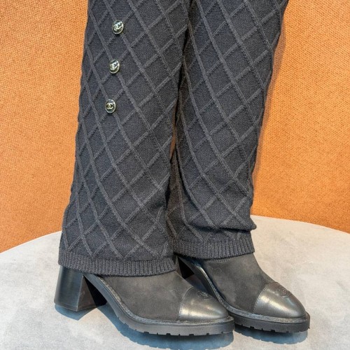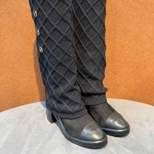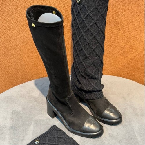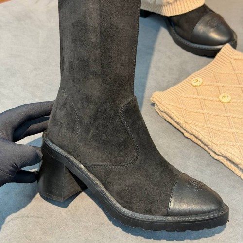 Черные сапоги Chanel с кожаным носком из натуральной замши. В паре носочная часть встречается с прямым широким голенищем-юбкой, которое дополнено декоративными пуговицами. Выразительный дизайн поможет легко вписать обувь в повседневный гардероб. В нашем интернет-магазине вы можете купить копии сапог с доставкой по Москве и по всей России.