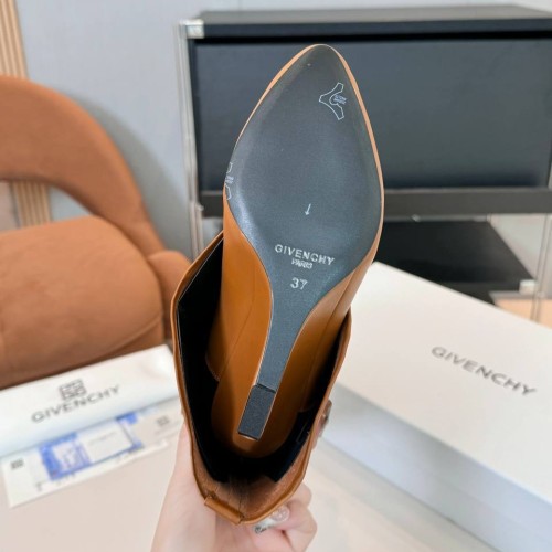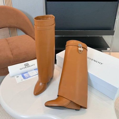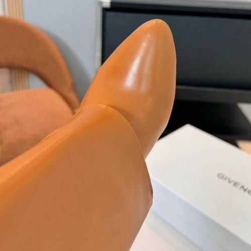 Светло-коричневые сапоги - трубы Givenchy из натуральной кожи. Сапоги, созданные с особым вниманием к деталям и конструкции. Дизайнеры подчеркнули модель широким голенищем, которое эффектно контрастирует с узкой заостренной носочной частью и устойчивым каблуком. В нашем интернет-магазине вы можете купить копии сапог с доставкой по Москве и по всей России.