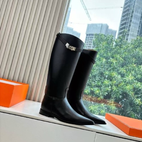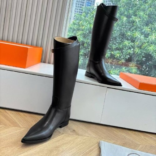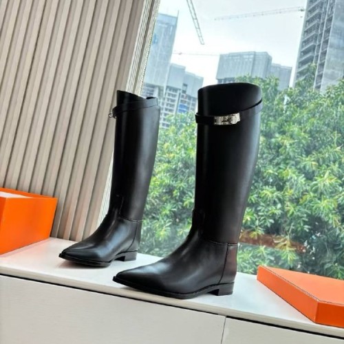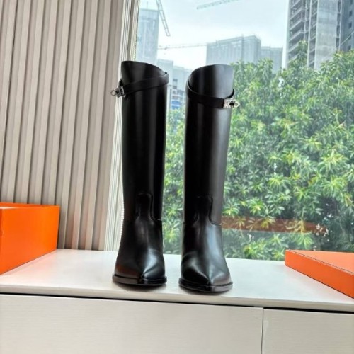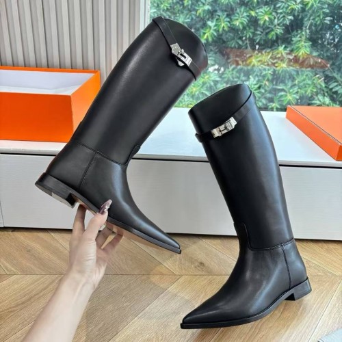 Черные женские сапоги Hermes из натуральной кожи. Дизайнеры дополнили модель удобной подошвой, которая позволяет комфортно чувствовать себя в течение всего дня и знаменитой пряжкой Келли. Заостренный носок придает паре элегантности. В нашем интернет-магазине вы можете купить копии сапог с доставкой по Москве и по всей России.