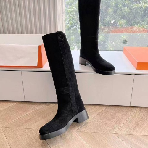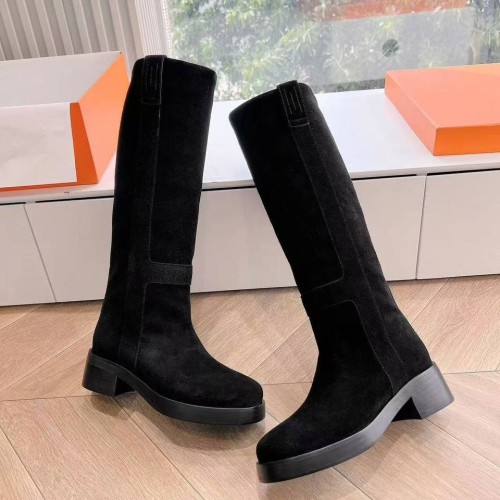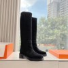 Черные женские сапоги Hermes из натуральной замши. Устойчивый каблук обеспечивает комфорт, а универсальный черный цвет делает пару идеальным выбором для повседневных образов. Носите пару с юбками, платьями, зауженными джинсами или легинсами. В нашем интернет-магазине вы можете купить копии сапог с доставкой по Москве и по всей России.