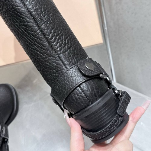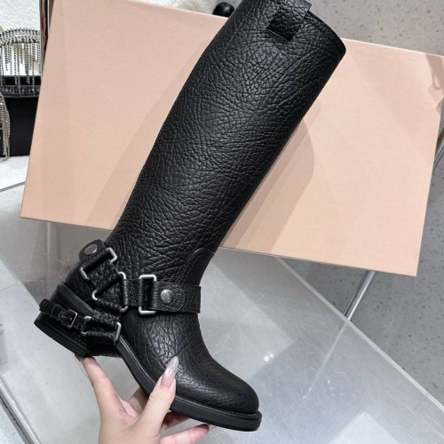 Черные женские сапоги Miu Miu из натуральной кожи. Акцент в лаконичном дизайне - фурнитура в серебристом оттенке и удобная подошва из облегченной резины. Эта пара легко станет ключевой деталью даже самого лаконичного образа, добавив индивидуальности. В нашем интернет-магазине вы можете купить копии сапог с доставкой по Москве и по всей России.