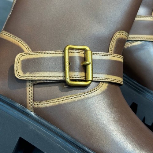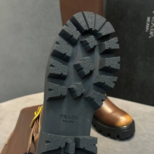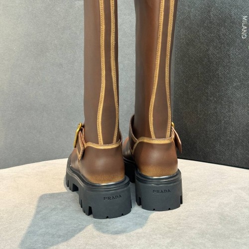 Коричневые женские сапоги Prada из натуральной кожи. Стильные сапоги могут стать акцентным элементом ваших образов. Модель из новой коллекции дополнена стилеобразующими элементами: ремешком на голенище и пряжкой в золотом оттенке. В нашем интернет-магазине вы можете купить копии сапог с доставкой по Москве и по всей России.