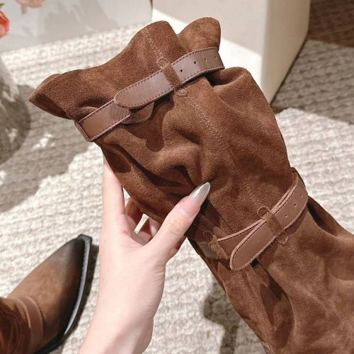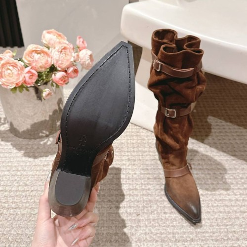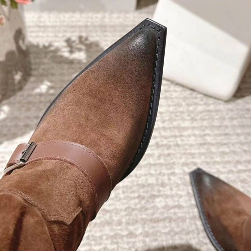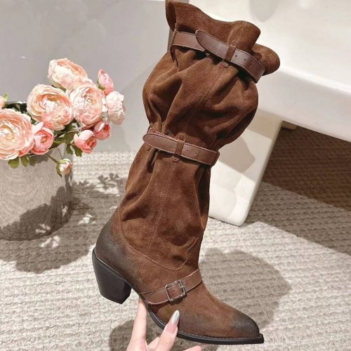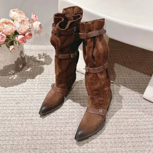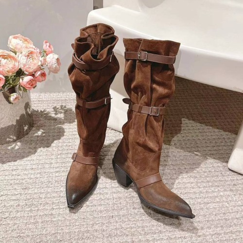 Женские коричневые сапоги R13 из натуральной замши со вставками из кожи. Модель отличается широкой формой голенища и заостренной носочной частью, а наличие ремней добавляет элегантности и удобства. Устойчивый каблук делает обувь практичной для повседневной носки. В нашем интернет-магазине вы можете купить копии сапог с доставкой по Москве и по всей России.