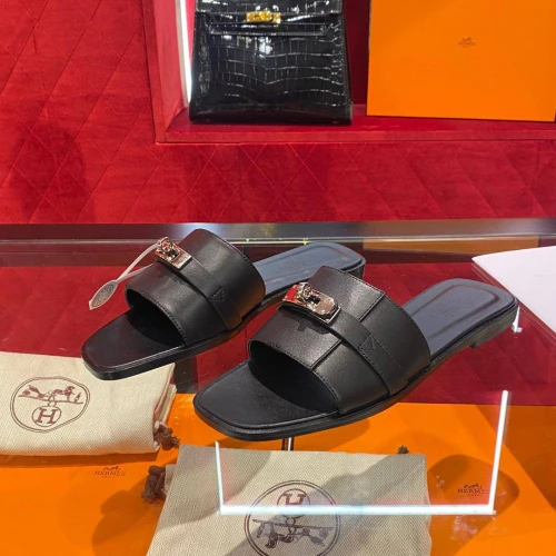 Женские шлепанцы от Hermes из натуральной кожи черного цвета. Обувь дополнена интересным металическим вставкой-декором. Удобная и практичная пара обуви для стильной девушки. В нашем интернет-магазине вы можете купить копии шлёпанцев с доставкой по Москве и по всей России.