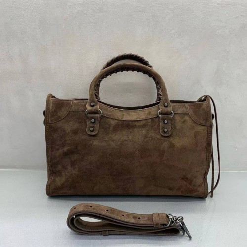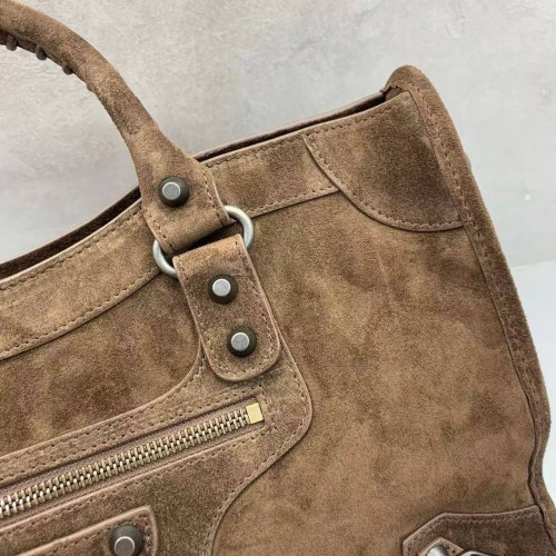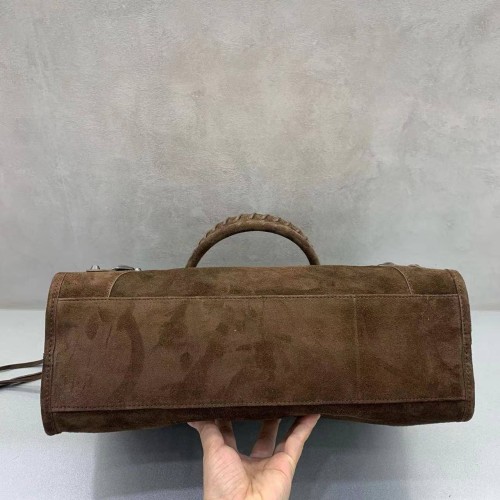 Сумка Balenciaga шоколадного оттенка из натуральной замши. Аксессуар отличается ручками с ручным плетением и съемным плечевым ремнем для универсальности ношения. Характерные элементы дизайна включают передний карман на молнии с кожаным бегунком и металлические пряжки. В нашем интернет-магазине вы можете купить копии сумок с доставкой по Москве и по всей России.