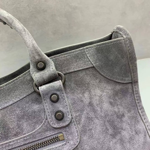Сумка Balenciaga серого оттенка из натуральной замши. Вихрь стиля и элегантности - это женская брендовая сумка - ненаглядная спутница вашего плеча. Она как дыхание свободы. Большая по своим возможностям, сделает любой образ девочки более роскошным и изысканным. В нашем интернет-магазине вы можете купить копии сумок с доставкой по Москве и по всей России.