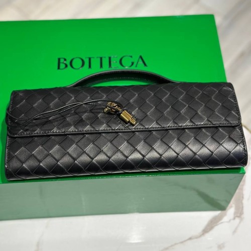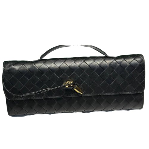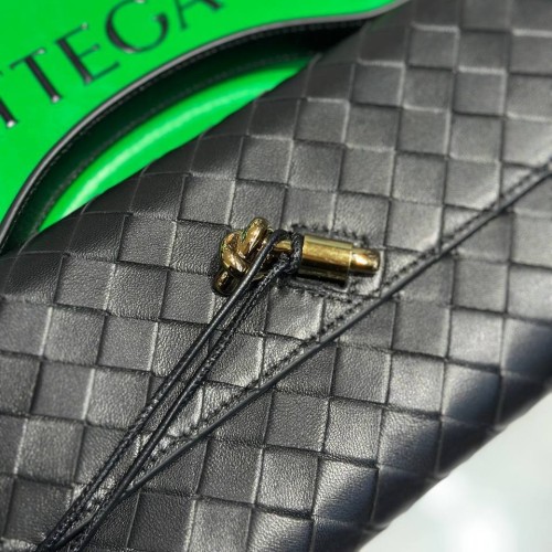Черная сумка-клатч Bottega Veneta из натуральной кожи. Идеальный аксессуар для современной женщины. Фирменная кожа Intrecciato, застежка-узел и удобная ручка делают его неповторимым. В нашем интернет-магазине вы можете купить копии сумок с доставкой по Москве и по всей России.