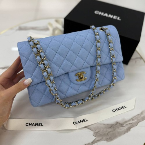 Голубая сумка Chanel ручной работы из натуральной кожи. Модель станет вашим незаменимым помощником для создания стильных и элегантных образов. При создании модели дизайнеры сделали фокус на удобство: вместительный аксессуар включает в себя множество отделений. В нашем интернет-магазине вы можете купить копии сумок с доставкой по Москве и по всей России.