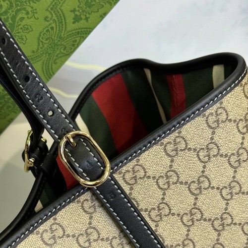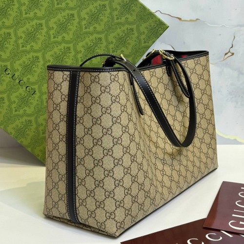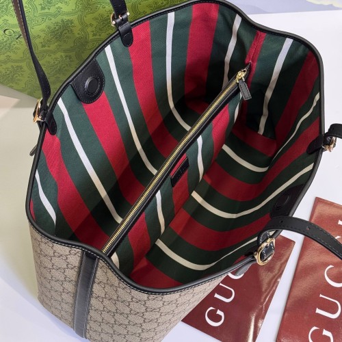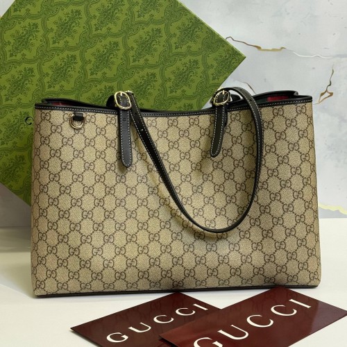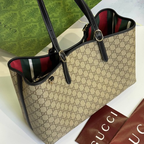 Черно-бежевая сумка Gucci из канвы и натуральной кожи. Вместительные отделения и карман на молнии обеспечивают местом для всего необходимого. Благодаря ремню с регулируемой длиной, эту большую сумку можно носить на плече или через плечо, и она станет идеальным повседневным спутником. В нашем интернет-магазине вы можете купить копии сумок с доставкой по Москве и по всей России.