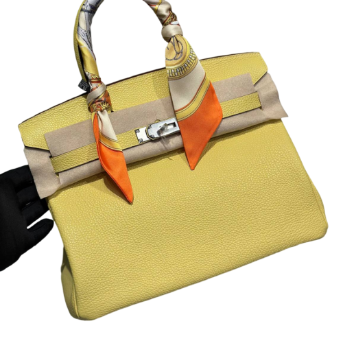 Желтая сумка Hermes из натуральной кожи с прожилками. Фурнитура придает изделию элегантности, а просторное основное отделение позволяет разместить все необходимые вещи. Стильная, универсальная и узнаваемая - эта сумка подчеркнет ваш статус и утонченность вкуса. В нашем интернет-магазине вы можете купить копии сумок с доставкой по Москве и по всей России.