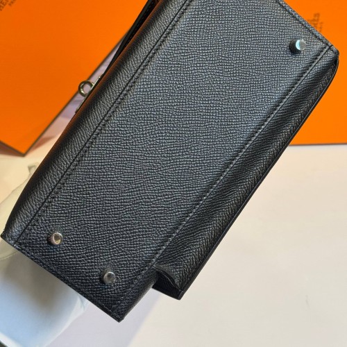 Черная сумка Hermes из натуральной кожи. Современный дизайн и лаконичный стиль делают этот аксессуар универсальным выбором для любого образа. Сумка с фурнитурой серебристого цвета выглядит очень стильно и элегантно. Такое сочетание часто добавляет изысканности и яркости образу. В нашем интернет-магазине вы можете купить копии сумок с доставкой по Москве и по всей России.