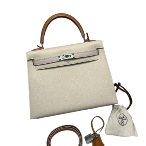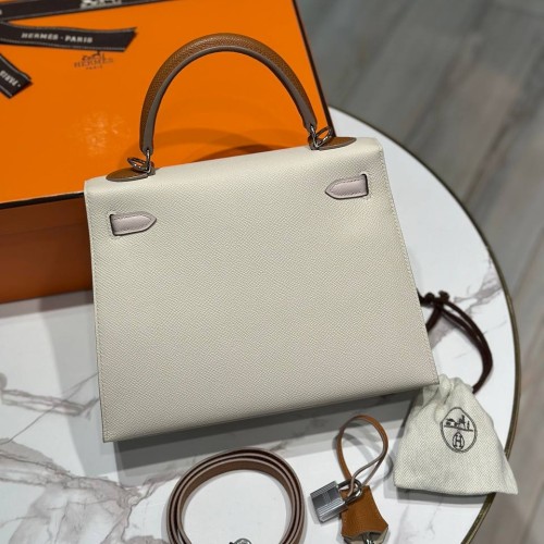 Белая сумка Hermes из натуральной кожи. Новое прочтение узнаваемого силуэта сумки Kelly. Модель с коричневой рукой и ремнем в комплекте. Такой аксессуар можно гармонично вписать ее в любой образ. В нашем интернет-магазине вы можете купить копии сумок с доставкой по Москве и по всей России.