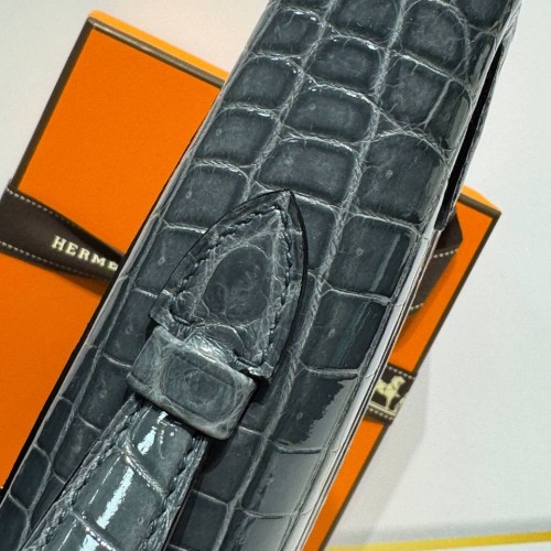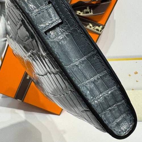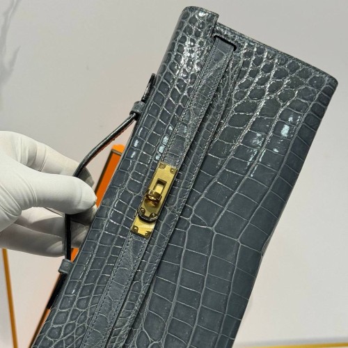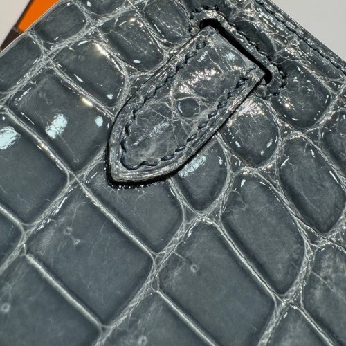 Серая сумка Hermes из лакированной кожи аллигатора. Глубину аксессуара выразительно подчеркивает фурнитура в золотом оттенке. Твердый каркас и минималистичный дизайн придают сумке строгое настроение. В нашем интернет-магазине вы можете купить копии сумок с доставкой по Москве и по всей России.