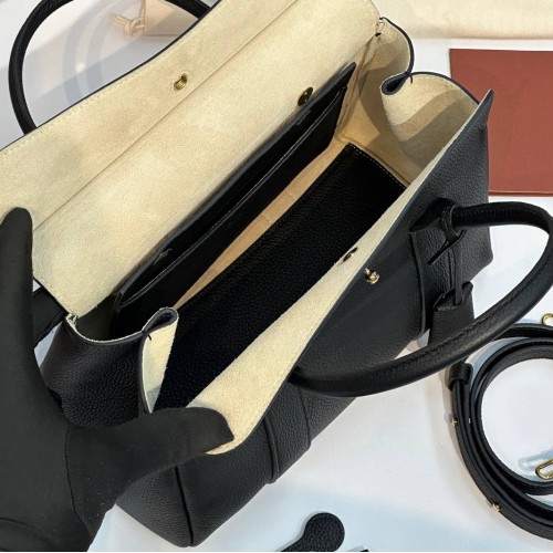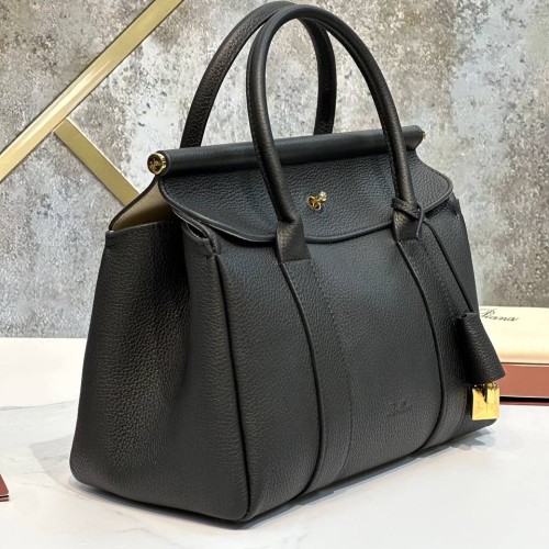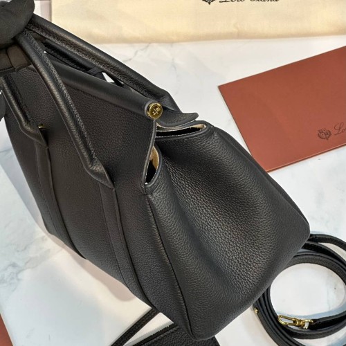 Черная сумка Loro Piana из натуральной кожи. Минималистичный дизайн расширяет вариативность стилизаций сумки. Фурнитура в благородном золотом оттенке вносит в дизайн тонкие выразительные детали. В модели предусмотрены короткие ручки и длинный ремень. В нашем интернет-магазине вы можете купить копии сумок с доставкой по Москве и по всей России.