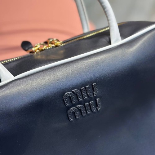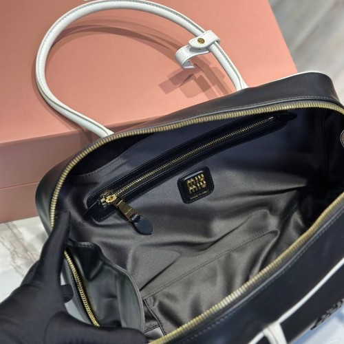 Черная сумка Miu Miu с белыми ручками и окантовкой из натуральной кожи. Аксессуар, который помогает выделиться из толпы и подчеркнуть индивидуальность. Сумка станет универсальным решением для любых стилизаций. В нашем интернет-магазине вы можете купить копии сумок с доставкой по Москве и по всей России.