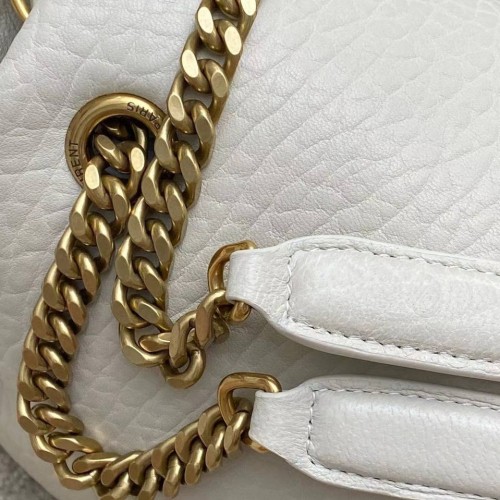 Белая сумка Saint Laurent из натуральной кожи. Пример того, как аксессуар может стать центральным элементом образа и выразить индивидуальность владелицы. Силуэт отсылает к золотой эпохе моды, когда аксессуары перестали быть просто практичными и обрели характер. В нашем интернет-магазине вы можете купить копии сумок с доставкой по Москве и по всей России.