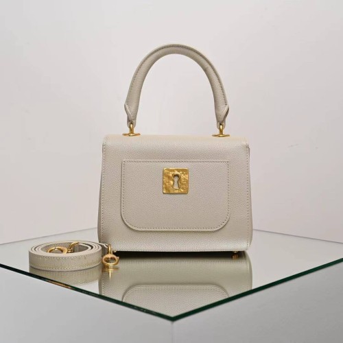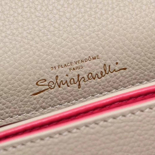 Сумка закрывается на клапан и фиксируется позолоченной застежкой в виде замка. Внутри: два отделения и один карман на молнии с гравировкой Schiaparelli на застежке, полностью отделана кожей ярко-розового цвета.