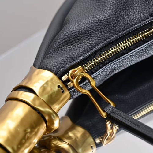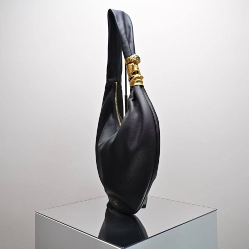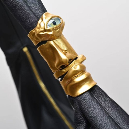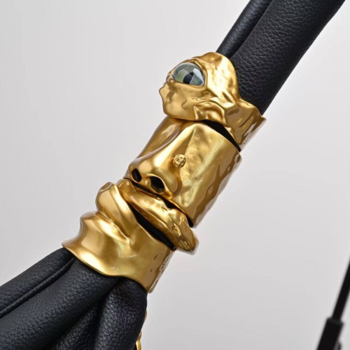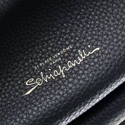 Черная сумка Schiaparelli из натуральной кожи. Сумка выполнена из черной зернистой кожи и отличается уникальной золотистой фурнитурой в виде скульптурных элементов, напоминающих части лица или тела, что является фирменным сюрреалистическим стилем бренда. Её элегантный дизайн позволяет легко интегрировать аксессуар в различные образы. В нашем интернет-магазине вы можете купить копии сумок с доставкой по Москве и по всей России.