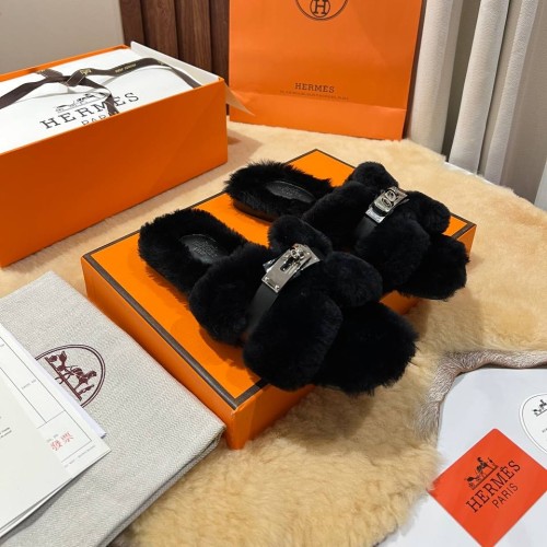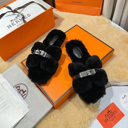 Черные женские тапочки Hermes из натурального меха. Открытые меховые тапочки - идеальный вариант для комфортного отдыха дома. Мягкая пара объединяет в себе стиль и удобство, хорошо сочетаясь с любым образом. В нашем интернет-магазине вы можете купить копии тапочек с доставкой по Москве и по всей России.